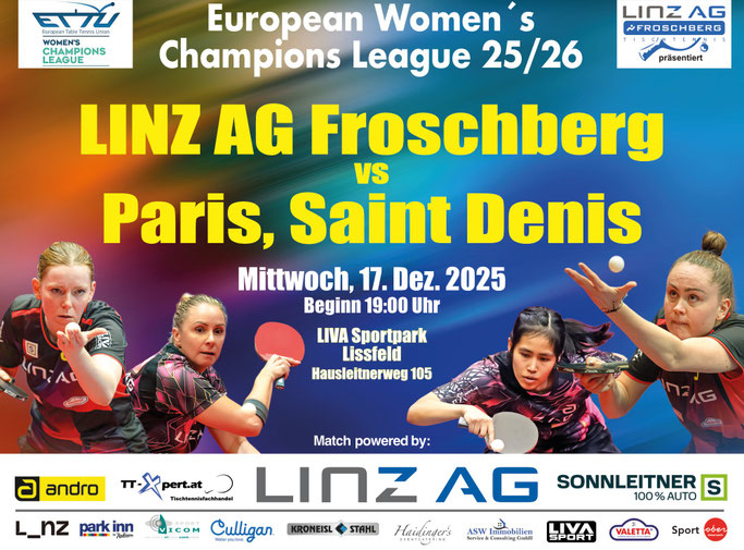 Der Einstieg in die neue Champions League Spielsaison 2025/2026 könnte für LINZ AG Froschberg schwerer nicht sein, denn niemand geringerer als der amtierende Championsleague-Sieger eastside Berlin ist der Auftaktgegner für das Linzer Frauen Quartet. Live zu sehen am Sonntag 13:00 Uhr auf ETTU TV